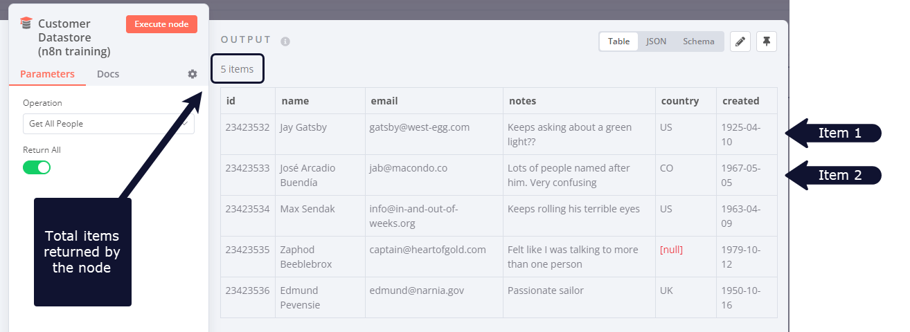 The data that moves along from node to node in your workflow must be in a format (structure) that can be recognized and interpreted by each node. In n8n, this required structure is an array of objects.